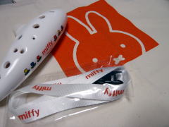 何に使うのかイマイチ分からないオカリナ、それからmiffyロゴ入りの携帯ストラップ、下に敷いてあるのはミッフィートートバッグです。