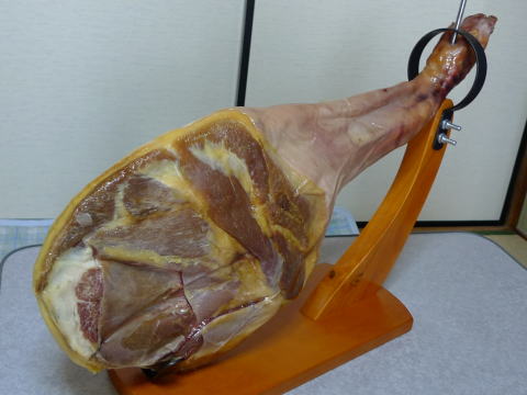 いや~、楽天のセールで4~5kgサイズの原木の生ハムが9,800円というスペシャルなプライスだったんですよ。しかも台座とナイフ付きで。