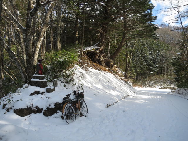 峠道の積雪は踝くらいの深さ。サラサラのパウダースノーですが、抵抗があるにはあります。