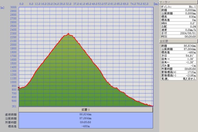 | コース概要 | 河口湖→富士スバルライン(登り)→富士山五合目→富士スバルライン(下り)→国道139号→小室浅間神社→国道139号→大月駅 |