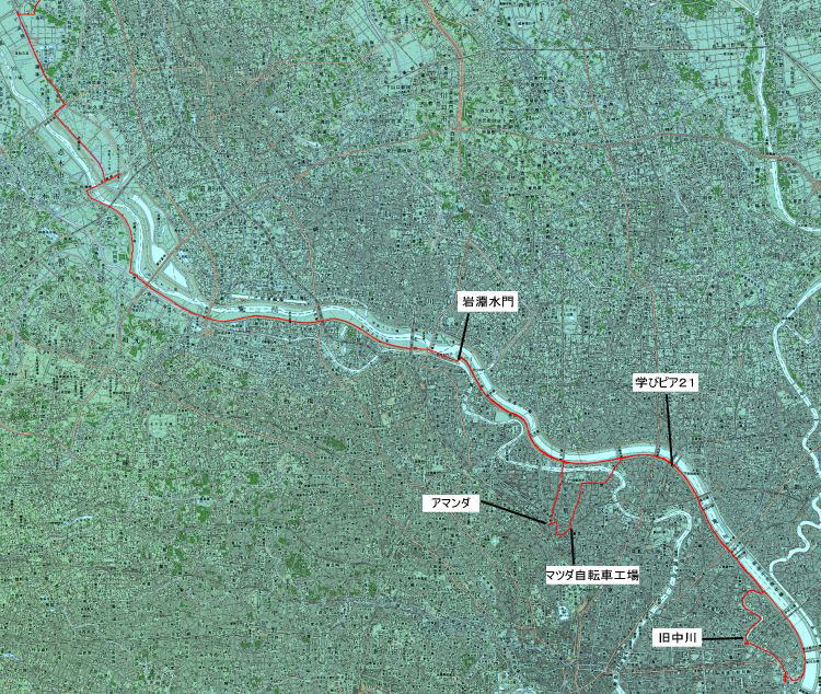 | コース概要 | 自宅→荒川サイクリングロード→秋が瀬公園→朝霞水門→岩淵水門→荒サイ→熊野前商店街→アマンダ→マツダ自転車工場→学びピア21→荒サイ→旧中川→荒サイ→自宅 |