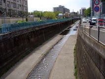 この辺りは、コンクリートで周りを固められていますね〜 | 電通研究所から先は、片側3車線の大通りの中央を流れていきます。 |