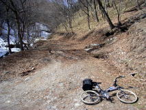 路面凍結注意との表示ですが、今日はとっても暖かなお天気♪ 細尾の集落より先は斜面がきつくなり、これまで距離にして16km程登ってきた足には結構堪えます(T T) |