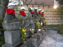 | 上記の謂われからか、境内にはたくさんの狐の像がありました。 | 大黒天と恵比寿は本堂左手の小さな祠に祀られています。 | 暗くてよく見えませんが、中に小さなお堂が造られているみたいです。あの中に祀られてるのかな〜? |
