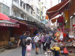 | 更に案内看板に従って文武二帝廟までやって来ました。 | 文武二帝廟がある富善街の周辺は大埔でもっとも古い街並みらしく。これまたアジアな雰囲気の活気あるマーケットになっていました。ゆっくり見ても面白そう | で、最後はMTR大埔墟駅から輪行して帰ることにしました。ハンドルを立てればこんな風に引いて歩くことができるブロンプトンは輪行に最適♪ |