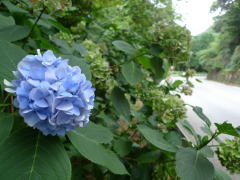 | ちょうど六甲トンネルの入口の真上辺り。下を走る車の音は聞こえますが、周りには車は少なく快適な道のり♪ | 基本的に展望は期待できないですが、時々有馬方面の展望を楽しめる場所があり、自転車で登る醍醐味を実感します | 裏六甲ドライブウェイは別名あじさいの道と呼ばれており、道沿いにはたくさんのあじさいが植えられてます。今日は8月ですが季節外れのあじさいに出会うことが出来ました |