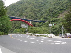 | ふと下側を見たらものすごい角度でつづら折れながら下っていることに気がつきました。こりゃスゴイ坂だ | 4kmほど下ったところで六甲有料道路の出口と合流しますが、車通りの多い道を避けて旧道(左折)へ向かいます | 六甲有料道路出口付近からの眺め。ここを右折すると手前に見える陸橋を渡ることが出来ます |