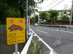 | 坂の途中にあった小さな休憩所からの眺め。だいぶん下ってきたのが分かりますね~ | 六甲ケーブル下駅付近でイノシシ注意の看板を発見。神戸の市街地まですぐそこなんだけどな~、この辺 | 灘の酒蔵巡りのスタート地点となる阪神大石駅へ向かうために県道95号を離れて住宅街へ。 |