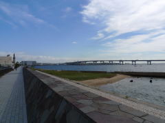 | 芦屋市総合公園の南側にある住宅地。中央を走る道沿いに人工と思われる水路が整備されてる~。何ともゆとりある造りですね~ | 潮芦屋人工海浜。埋め立て地に人工的に砂浜を造っちゃいました的な・・・ | 海沿いを走って芦屋大橋へ向かい、本州側へ渡ります。 |