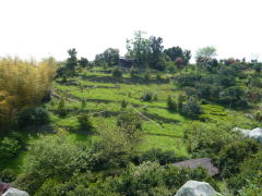| 向かい側の山の斜面に石垣を積んだ畑が!よく作ったものだと感心しますよね~ | やっと登り切って石垣山歴史公園入口。ものすごく疲れた、とりあえず休憩しよう・・・ | 入り口より先は自転車では登れないのですが、当時の石垣が残された公園内はシャガ(著莪)の花がちょうど見頃となっててとてもキレイでした。 |