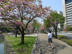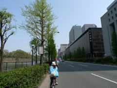 | 日比谷公園南側にある市政会館はいつ見ても綺麗な建物だなぁ。 | 道路を暴走する自転車野郎ではなく、パレスサイクリングで自転車天国を満喫中〜♪ | 皇居北側では八重桜がちょうど見頃でした。ランニングしている人もたくさんいましたよ。 |