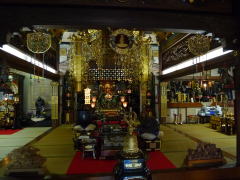 | 重厚な造りの本殿は1722年に再建されたもので、今日もたくさんの人がお参りに来てました | どうやら本堂の中に入れそうなので入ってみた。中に入ると大黒天に直接お参りできます。ちょっと分かりにくいですが大黒天の後ろにある大黒天画像は徳川家光の寄進だとか | 本殿の隣には立派な楽堂もあります |