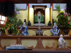 | こちらが本堂。コンクリート造で比較的新しい。自転車を入れさせてくれたり案内マップをくれたりとサービス満点♪ | 本堂の中に入ることもできます。ご本尊の左手に目をやると・・・ | 布袋尊を発見!大きくて迫力あるなぁ。そしてこの表情がまた何ともイイ! |